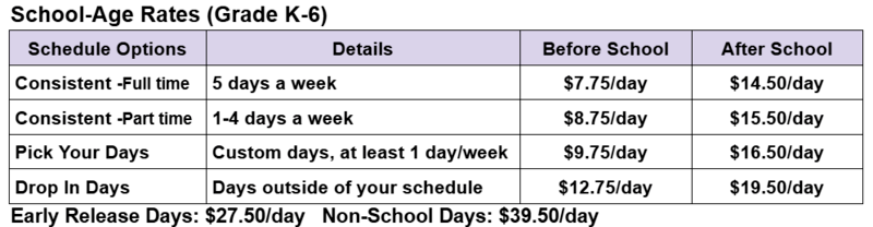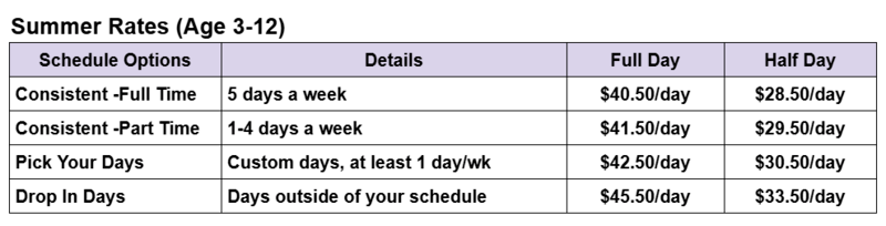 Consistent Schedule: Choose this option if you need care on the same days of the week each month. 5 days a week is required for Full Time Rates. 1-4 days per week are required to receive Part Time Rates.