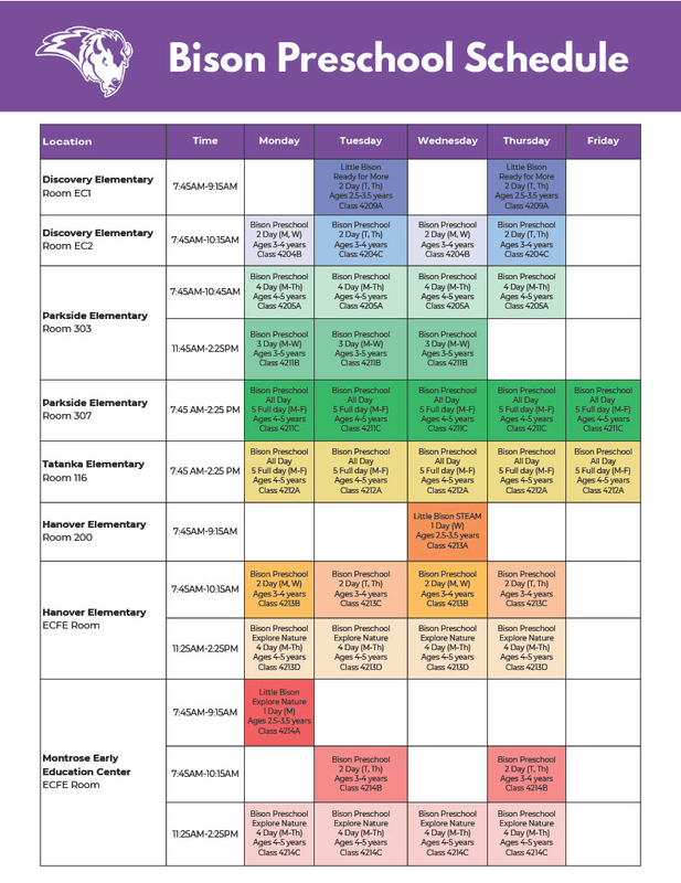 Preschool is an important part of building the skills your child will use as they move toward Kindergarten age. It is an exciting time for children to grow through learning with friends. During our Bison Preschool classes, children will experience large and small group activities that focus on language development, building social skills, pretend play, early academics including, early literacy, math, and writing skills. There are also opportunities for art, science, and outdoor play activities. Our preschool classes are taught by Licensed Early Teachers in partnership with Early Childhood Special Education teachers and are created for all children.