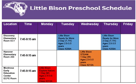 Little Bison Preschool offerings include: Explore Nature (Montrose Early Education Center), STEAM (Hanover Elementary) and Little Bison Preschool-Ready For More (Discovery Elementary)